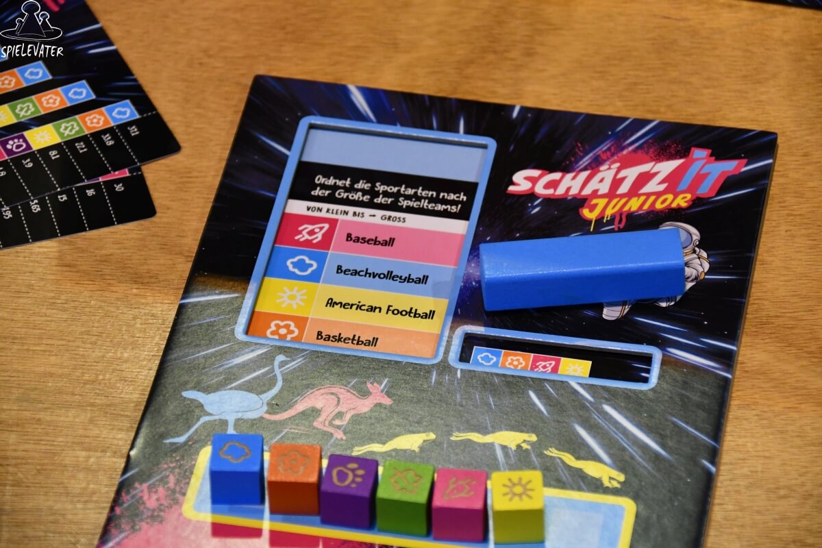 Passend zum Spiel „Schätz it if you can!“ von 2023 kommt jetzt eine Kinder- und Familienspiel Variante auf den Markt. Die einzelnen Aufgaben sind jetzt weniger kompliziert und für Kinder greifbarer. Das Spielprinzip bleibt dabei nahezu unverändert. Es gilt zu einem Überbegriff entsprechende Begriffe zu sortieren. Mal von gross nach klein, mal von leicht bis schwer oder von langsam nach schnell. Dabei spielen alle zusammen und es entsteht eine lebhafte Diskussion über die korrekte Reihenfolge. Nicht selten endet dann eine Runde mit grossem Erstaunen.