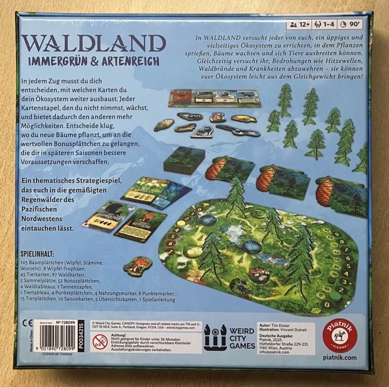 Mit „Waldland“ entführt Piatnik Spielende in die üppigen Wälder Nordamerikas, wo sie Verantwortung über ein eigenes Waldgebiet übernehmen. Ziel ist es, über drei Saisonen hinweg ein gesundes und stabiles Ökosystem aufzubauen, Tiere anzusiedeln, Bäume wachsen zu lassen und Bedrohungen wie Feuer oder Trockenheit abzuwehren.