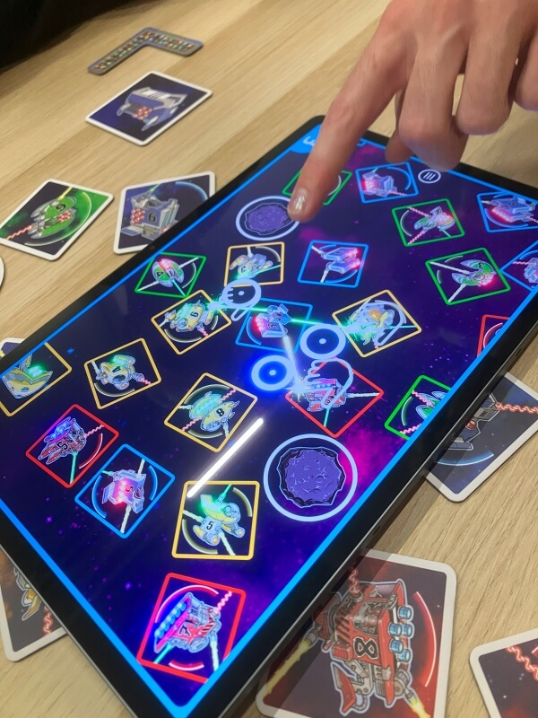 Sind alle Raumschiffe platziert, erfolgt die Auswertung. Welcher Laser-Strahl trifft welches Ziel? Um diese Auswertung nicht händisch machen zu müssen, gibt es die App zum Spiel (auf Tablett oder Smartphone). Einfach die Spielfläche mit der App einscannen und schon beginnt die Auswertung. Die App prüft entsprechend der Reihenfolge, in der die Raumschiffe ihre Waffen abfeuern, die Treffer, zählt die Punkte und wertet alles aus.