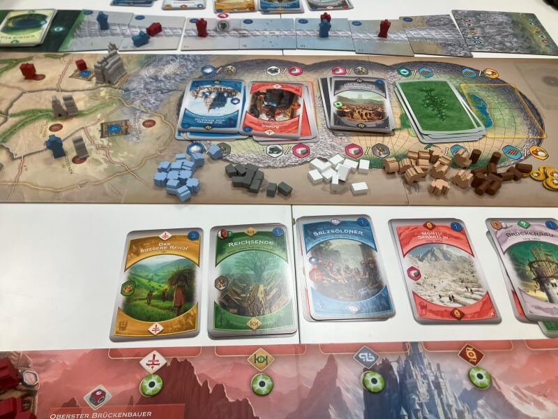 Haben wir jetzt die passenden Rohstoffe in unseren Lagern, dürfen wir an der Brücke bauen und so dem Spielende einen Schritt näher zu kommen und Punkte zu erzielen. Können wir jedoch in einer Runde nicht an der Brücke bauen, so bauen stattdessen Rebellen an der Brücke. Sie sind quasi ein weiteres Volk das an der Brücke baut und uns das Leben beim Punkten deutlich erschweren. So ist aber auch sichergestellt, dass das Spiel nach nur acht Runden in die Endwertung geht.