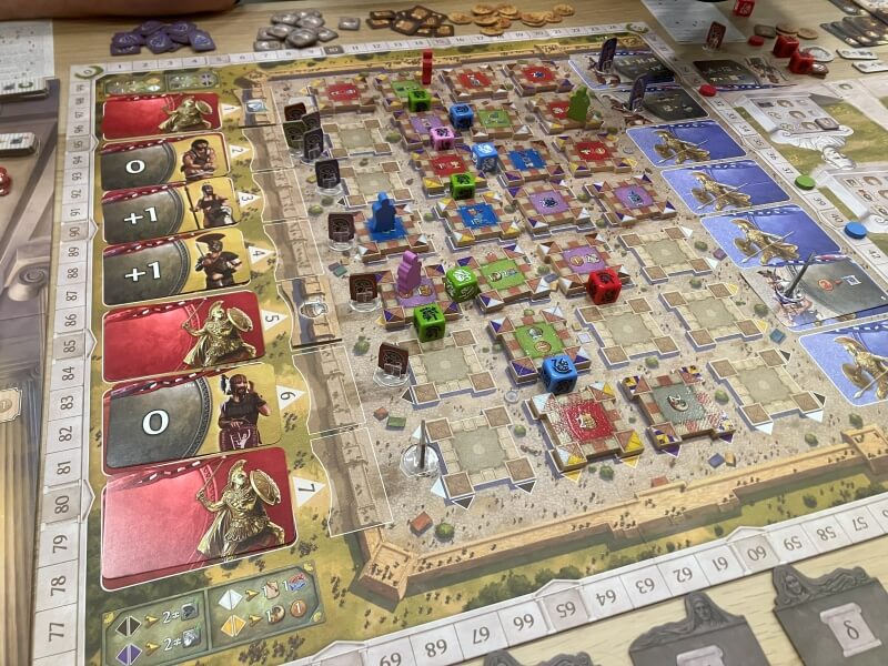 Nach drei Stunden reiner Spielzeit war unsere Partie vorbei und wir waren erst einmal platt, obwohl wir bei Halbzeit ein stärkendes Abendessen hatten. Zurückgelassen hat mich das Spiel mit gemischten Gefühlen. Einerseits war es cool, die kleinen Zahnrädchen des Spiels zu justieren und eine mögliche Strategie zu finden, andererseits war ich oft erschlagen von der Tischpräsenz. Möglichst nicht übersehen und immer auch ein Auge auf die Mitspielenden haben und dabei noch den vermeintlich besten Zug durchzuführen, war echt anstrengend. Hinzu kam, dass für mich das Thema, das Setting, völlig belanglos war und ich nie das Gefühl hatte hier in der Antike zu sein.